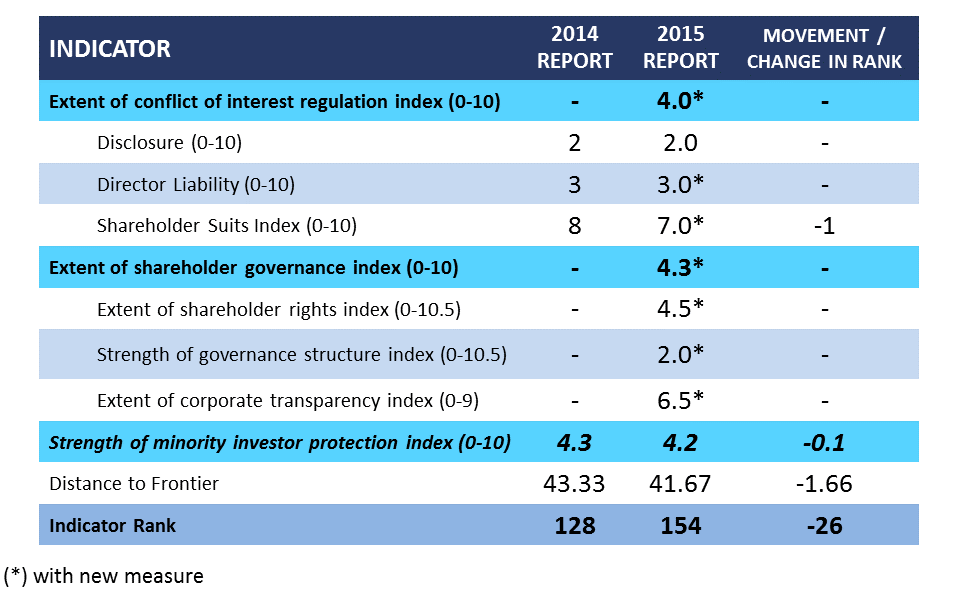 0-10) and shareholders’ ability to sue officers and directors for misconduct (ease of shareholder suits index. 0-10).